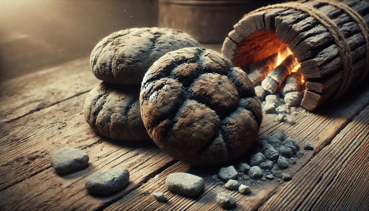 Historical Context: Ash cakes were a common form of bread baked by placing dough directly on hot stones or coals. They were simple and quick to prepare, making them ideal for travelers or those in difficult conditions.